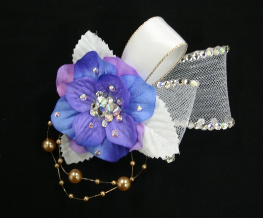 造花のコサージュにホースヘアのリボンを使用 |